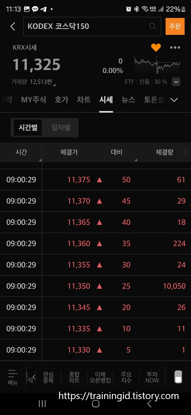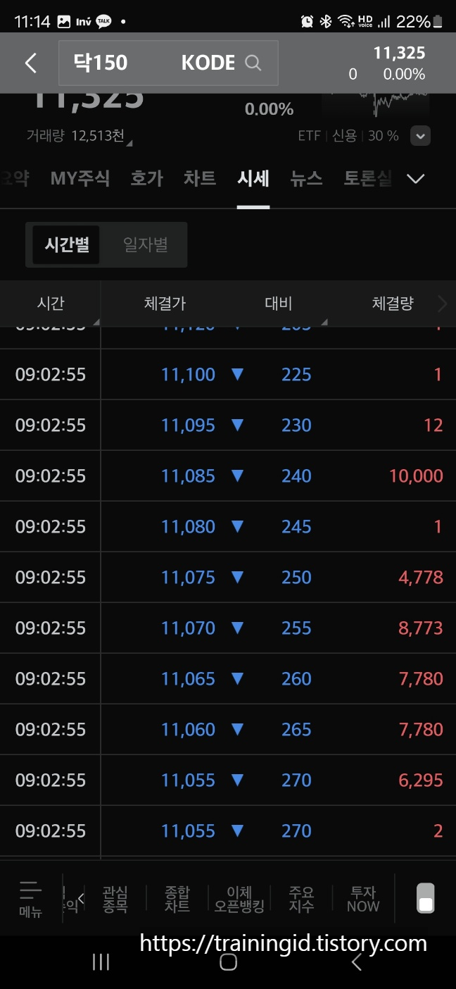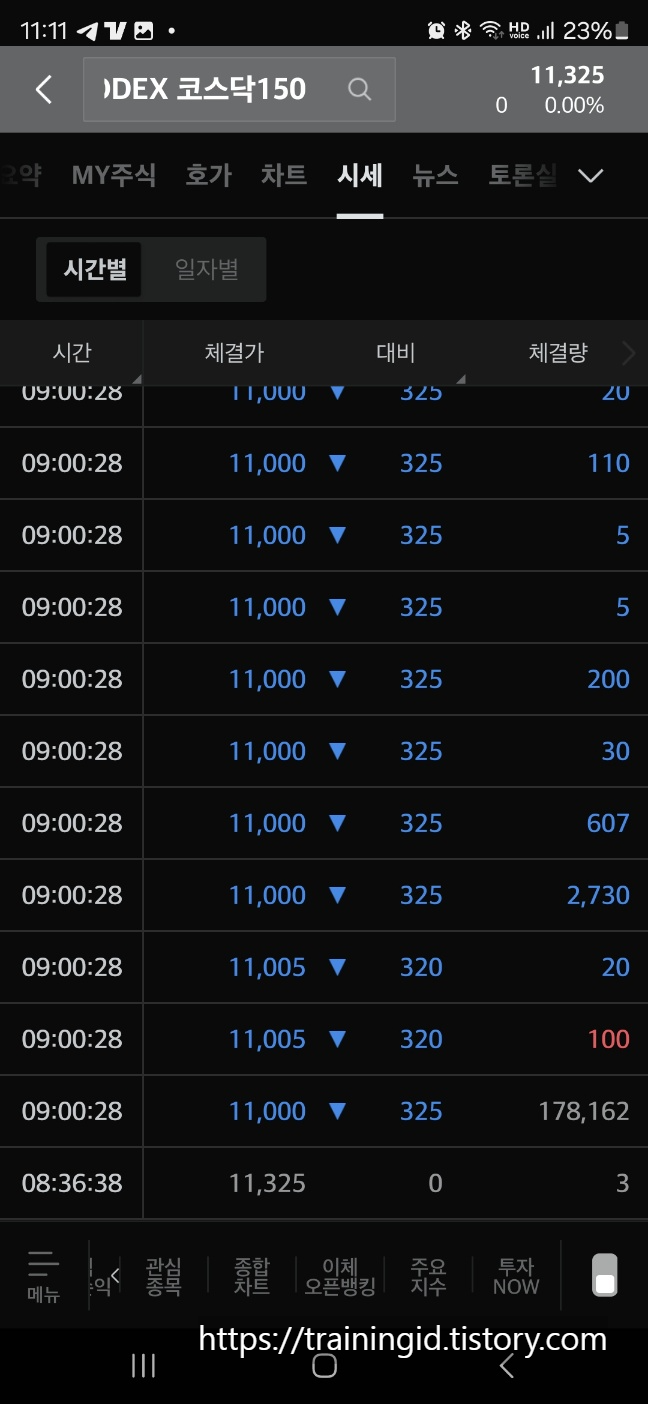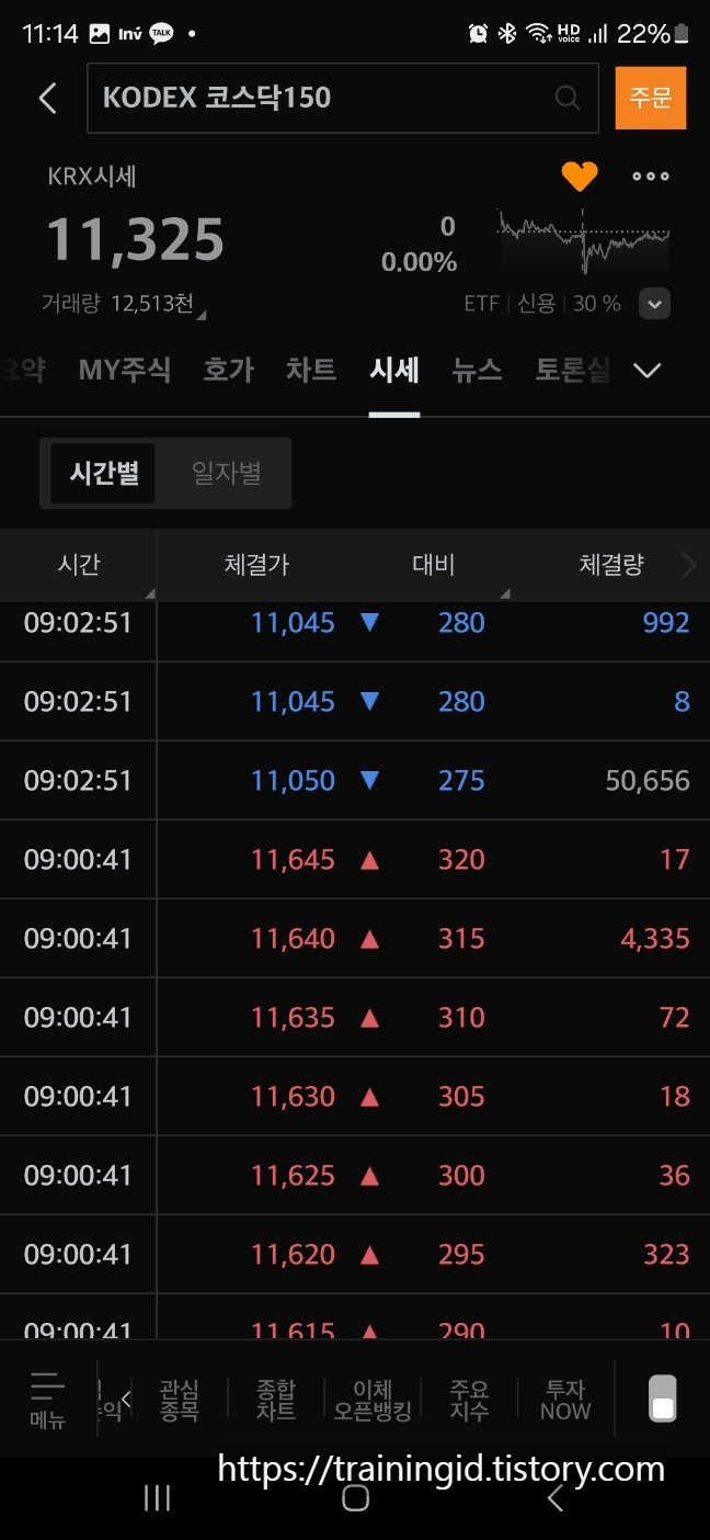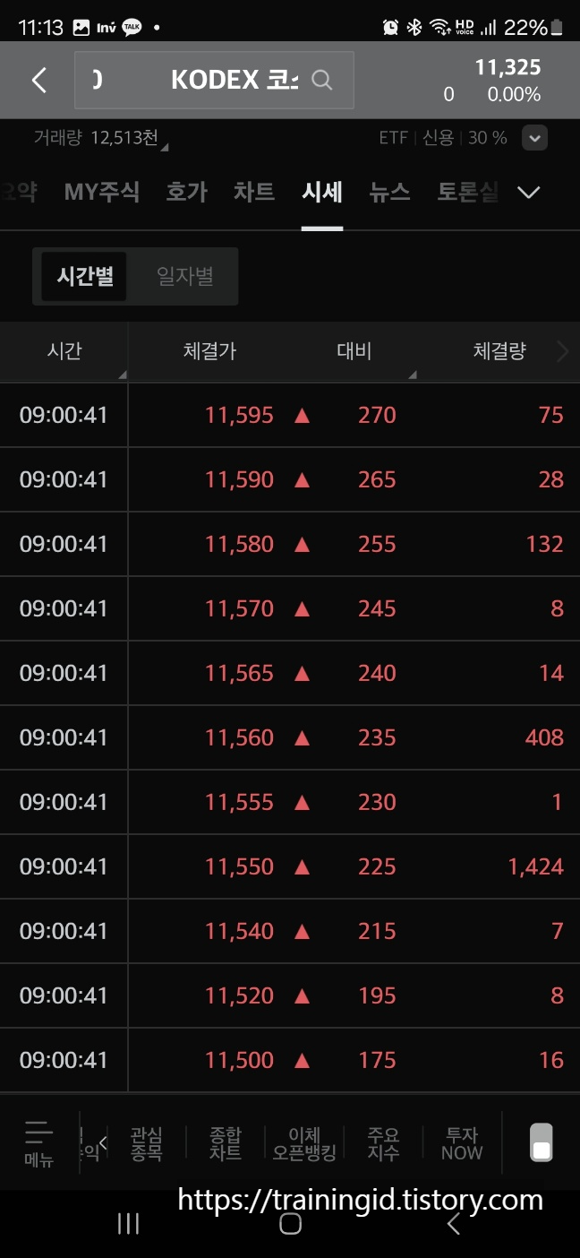 8. 11,645원 오늘의 고점이 체결되고 난 후에 잠시 동안 거래가 멈추게 됩니다. 제가 잘 몰라서 그러는데 ETF는 저점대비 5%로 VI가 걸리는가 싶기도 합니다. 5만 주가 한꺼번에 체결되며 다시 iNAV에 맞춰 정상화 됩니다.