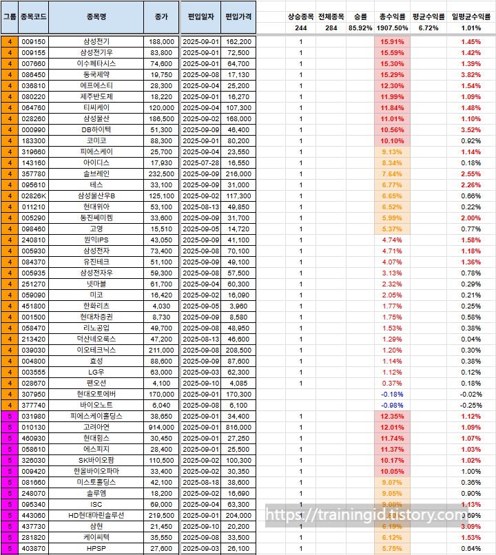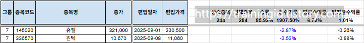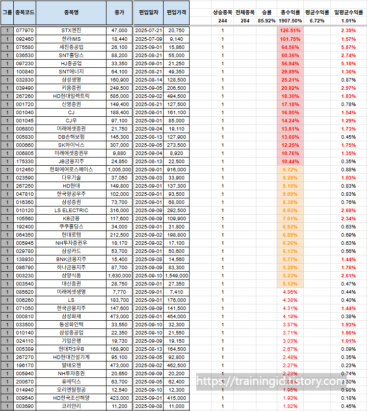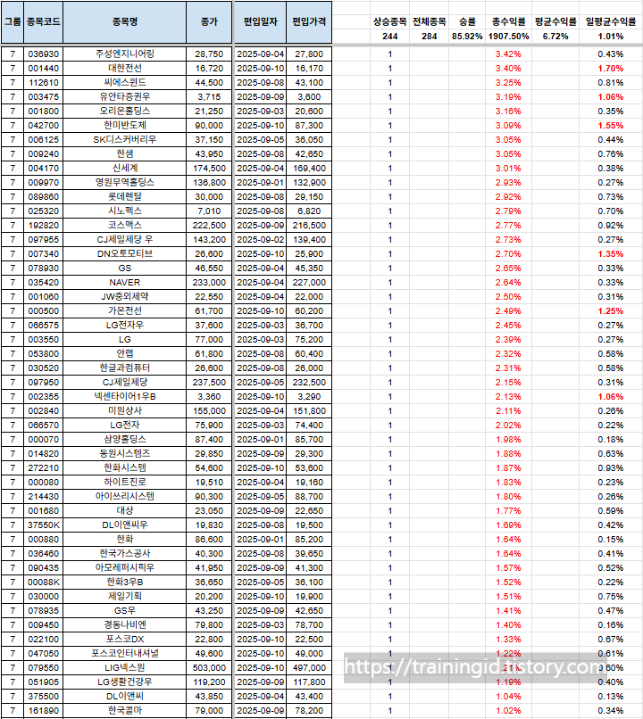 종목이 많이 걸러지는 관계로, 남아있는 포트폴리오, 신규 편입 종목, 당일 편출 종목만을 올려두겠습니다. 전일 자료는 전일 포스팅을 참고하여 주시기 바랍니다.