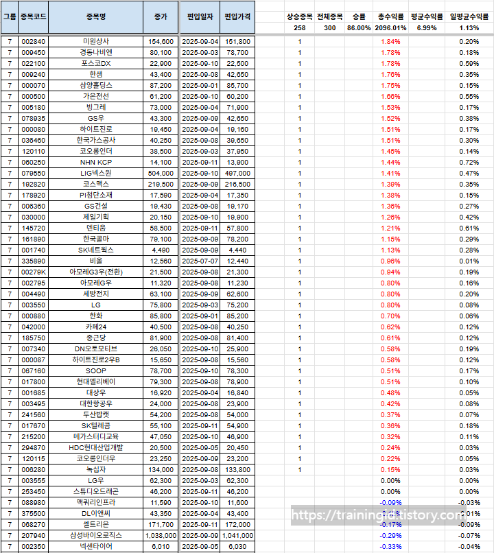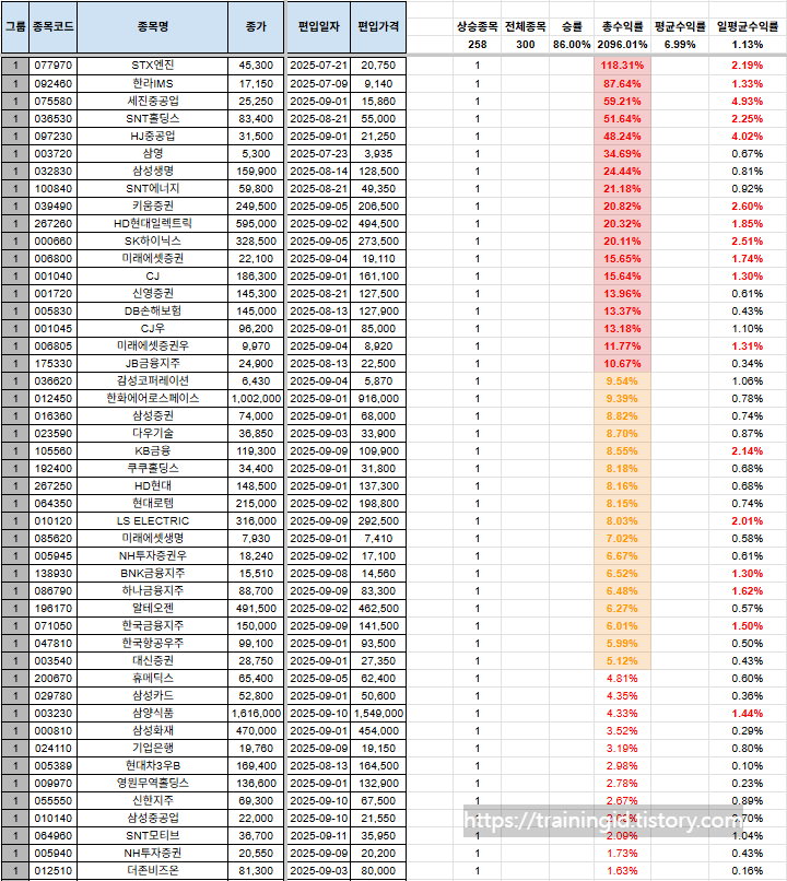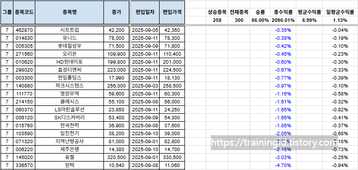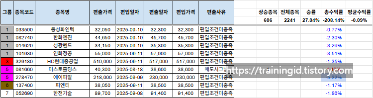 종목이 많이 걸러지는 관계로, 남아있는 포트폴리오, 신규 편입 종목, 당일 편출 종목만을 올려두겠습니다. 전일 자료는 전일 포스팅을 참고하여 주시기 바랍니다.
