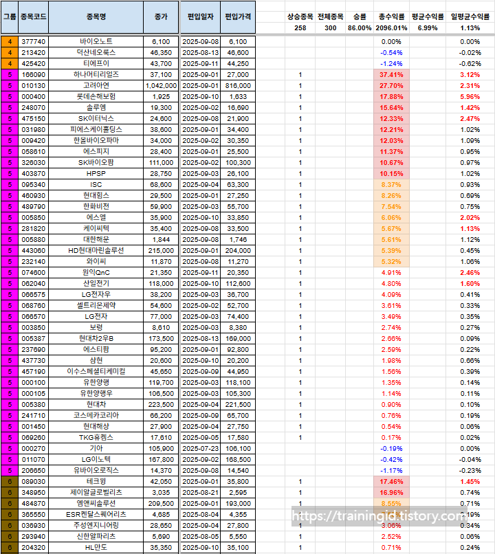 그리고, 그룹에 대한 질의 사항이 있어서 간단하게 설명 드리자면, 1그룹~7그룹까지 있으며, 1그룹으로 갈수록 강한 추세를 의미합니다. 7그룹은 이제 막 반등을 시작하는 그룹으로 해석하시면 됩니다.