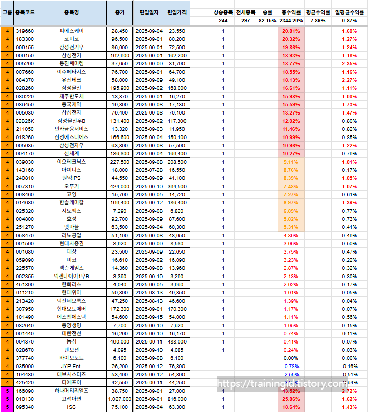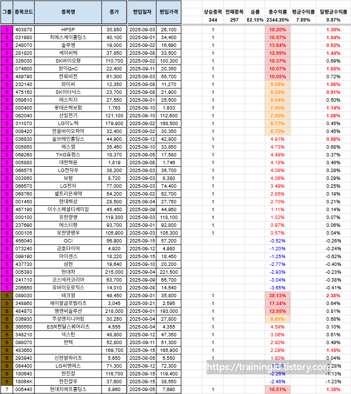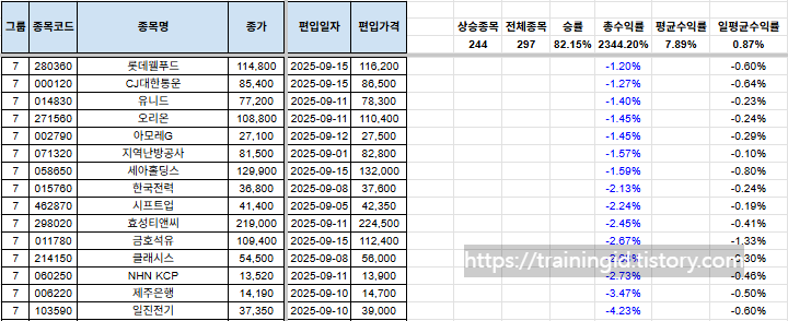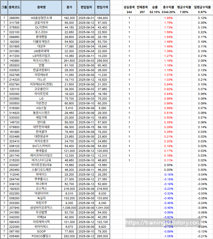 종목이 많이 걸러지는 관계로, 남아있는 포트폴리오, 신규 편입 종목, 당일 편출 종목만을 올려두겠습니다. 전일 자료는 전일 포스팅을 참고하여 주시기 바랍니다.