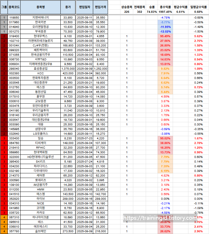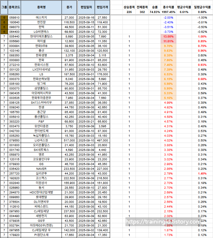 그리고, 그룹에 대한 질의 사항이 있어서 간단하게 설명 드리자면, 1그룹~7그룹까지 있으며, 1그룹으로 갈수록 강한 추세를 의미합니다. 7그룹은 이제 막 반등을 시작하는 그룹으로 해석하시면 됩니다.