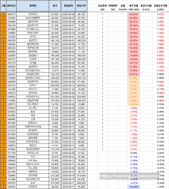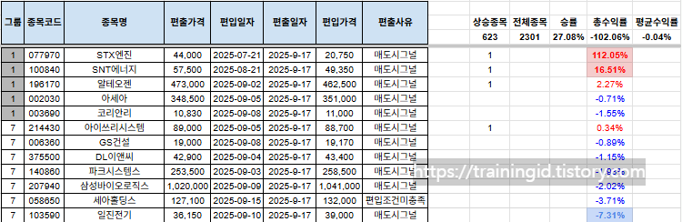 종목이 많이 걸러지는 관계로, 남아있는 포트폴리오, 신규 편입 종목, 당일 편출 종목만을 올려두겠습니다. 전일 자료는 전일 포스팅을 참고하여 주시기 바랍니다.