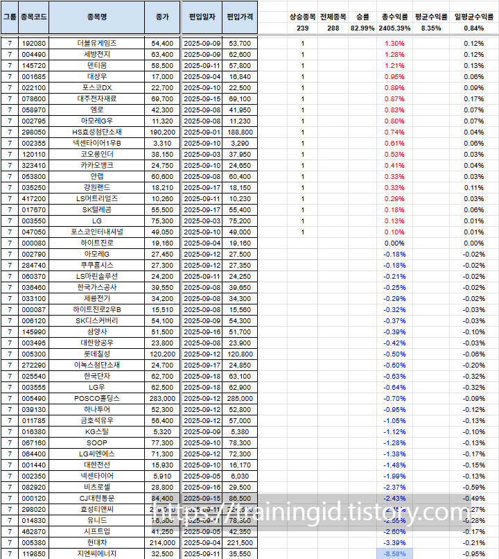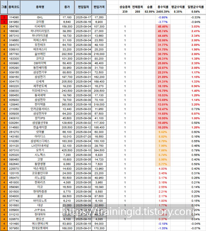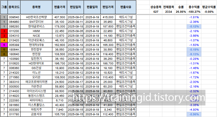 종목이 많이 걸러지는 관계로, 남아있는 포트폴리오, 신규 편입 종목, 당일 편출 종목만을 올려두겠습니다. 전일 자료는 전일 포스팅을 참고하여 주시기 바랍니다.