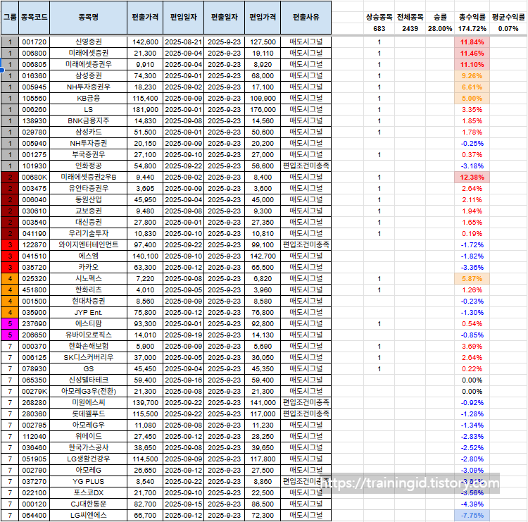 그리고, 그룹에 대한 질의 사항이 있어서 간단하게 설명 드리자면, 1그룹~7그룹까지 있으며, 1그룹으로 갈수록 강한 추세를 의미합니다. 7그룹은 이제 막 반등을 시작하는 그룹으로 해석하시면 됩니다.