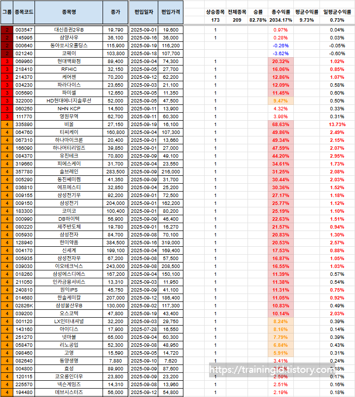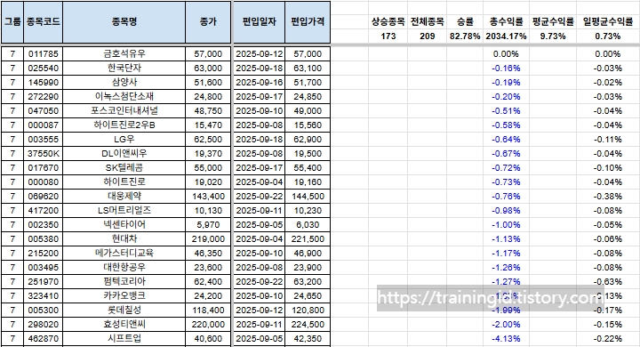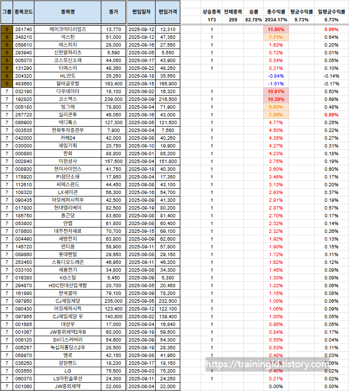 종목이 많이 걸러지는 관계로, 남아있는 포트폴리오, 신규 편입 종목, 당일 편출 종목만을 올려두겠습니다. 전일 자료는 전일 포스팅을 참고하여 주시기 바랍니다.