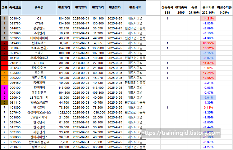 그리고, 그룹에 대한 질의 사항이 있어서 간단하게 설명 드리자면, 1그룹~7그룹까지 있으며, 1그룹으로 갈수록 강한 추세를 의미합니다. 7그룹은 이제 막 반등을 시작하는 그룹으로 해석하시면 됩니다.
