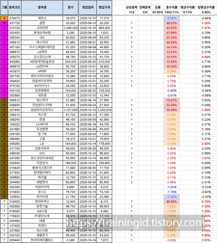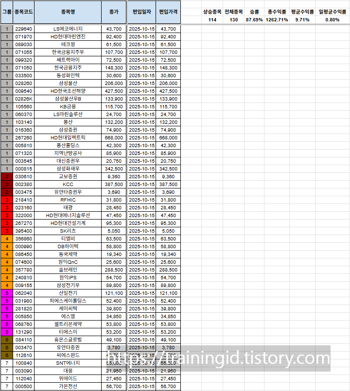 그리고, 그룹에 대한 질의 사항이 있어서 간단하게 설명 드리자면, 1그룹~7그룹까지 있으며, 1그룹으로 갈수록 강한 추세를 의미합니다. 7그룹은 이제 막 반등을 시작하는 그룹으로 해석하시면 됩니다.