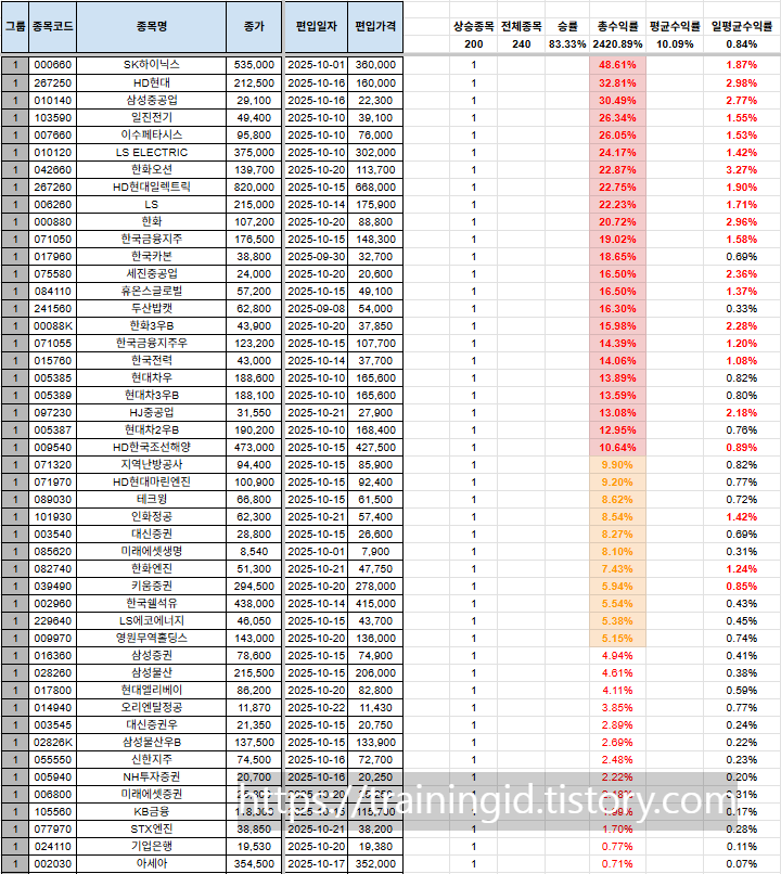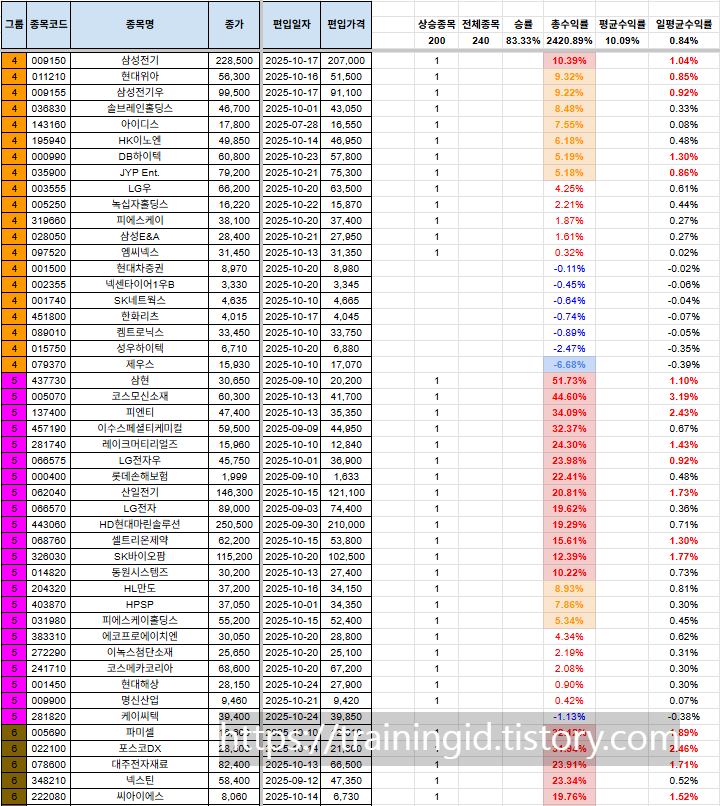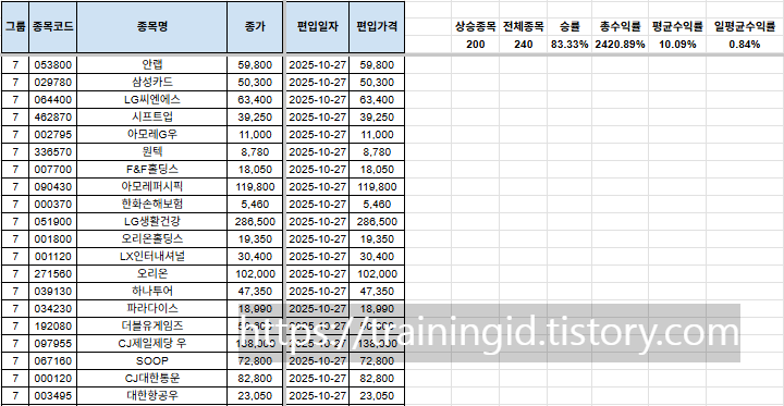 종목이 많이 걸러지는 관계로, 남아있는 포트폴리오, 신규 편입 종목, 당일 편출 종목만을 올려두겠습니다. 전일 자료는 전일 포스팅을 참고하여 주시기 바랍니다.