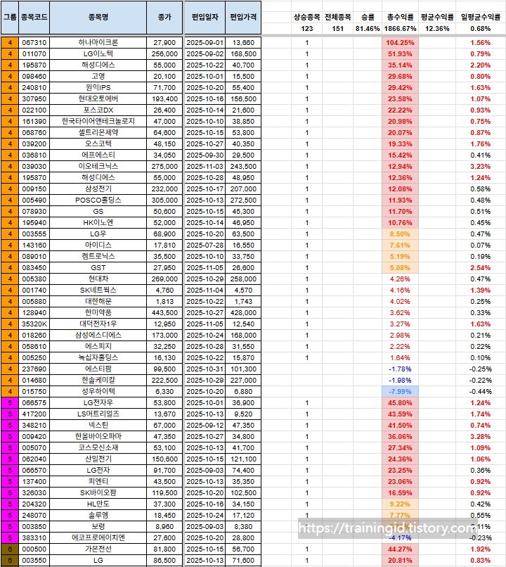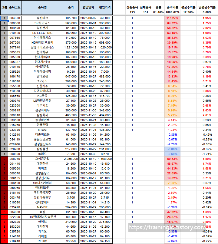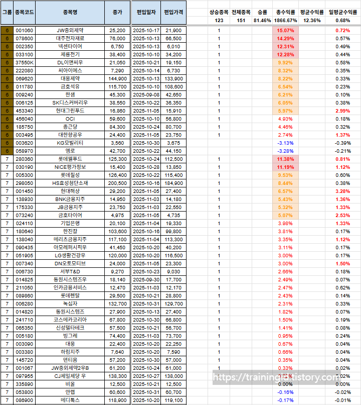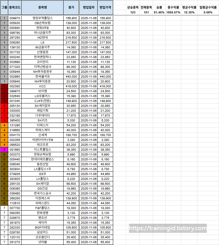 그리고, 그룹에 대한 질의 사항이 있어서 간단하게 설명 드리자면, 1그룹~7그룹까지 있으며, 1그룹으로 갈수록 강한 추세를 의미합니다. 7그룹은 이제 막 반등을 시작하는 그룹으로 해석하시면 됩니다.