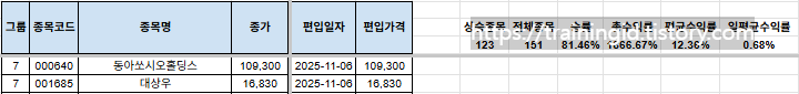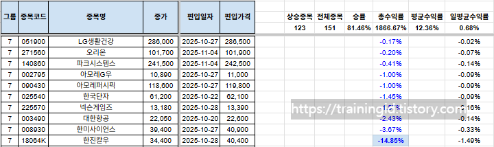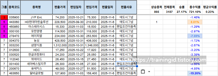 종목이 많이 걸러지는 관계로, 남아있는 포트폴리오, 신규 편입 종목, 당일 편출 종목만을 올려두겠습니다. 전일 자료는 전일 포스팅을 참고하여 주시기 바랍니다.