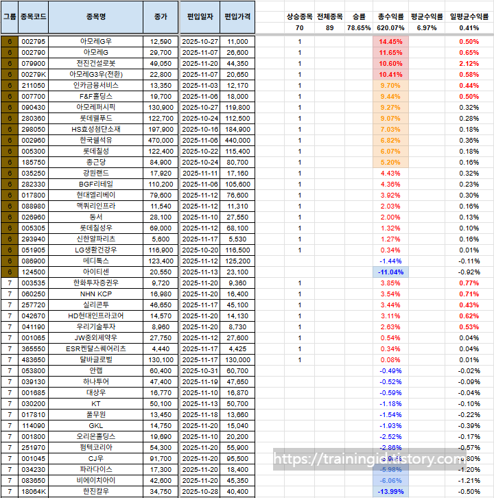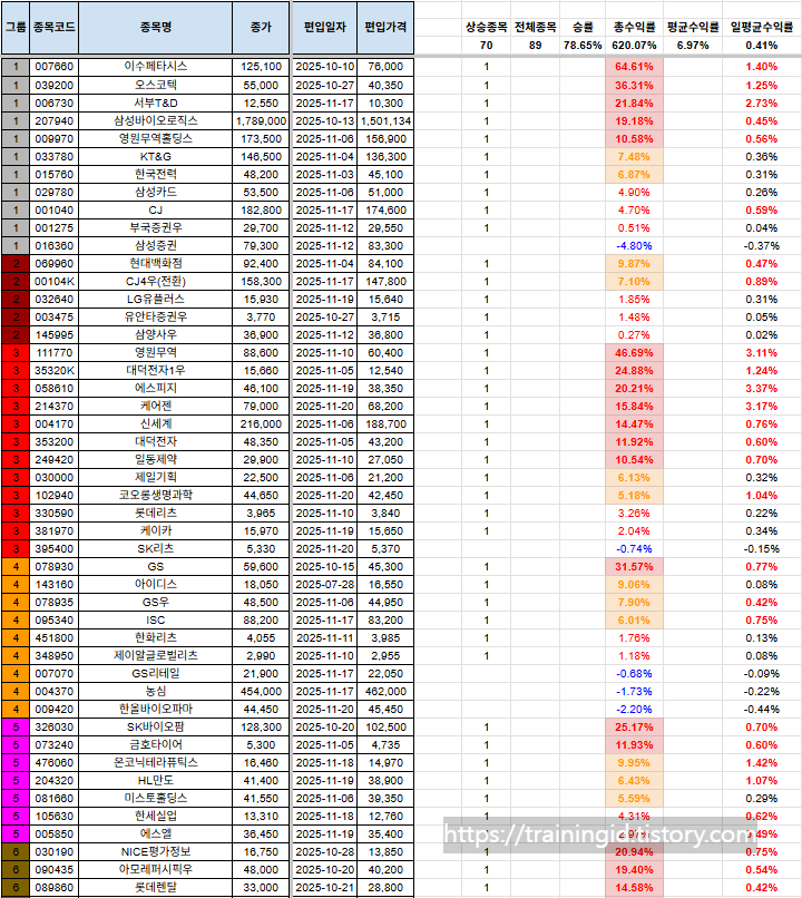 그리고, 그룹에 대한 질의 사항이 있어서 간단하게 설명 드리자면, 1그룹~7그룹까지 있으며, 1그룹으로 갈수록 강한 추세를 의미합니다. 7그룹은 이제 막 반등을 시작하는 그룹으로 해석하시면 됩니다.