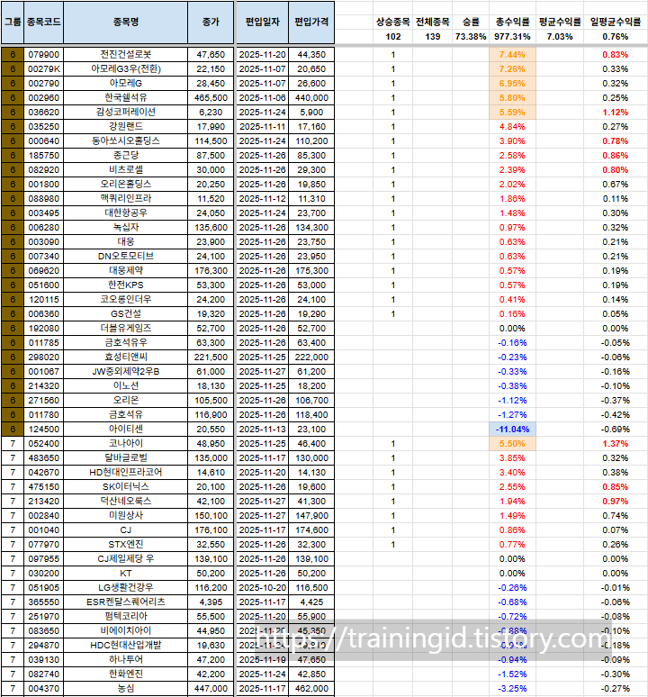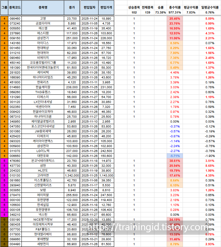 그리고, 그룹에 대한 질의 사항이 있어서 간단하게 설명 드리자면, 1그룹~7그룹까지 있으며, 1그룹으로 갈수록 강한 추세를 의미합니다. 7그룹은 이제 막 반등을 시작하는 그룹으로 해석하시면 됩니다.