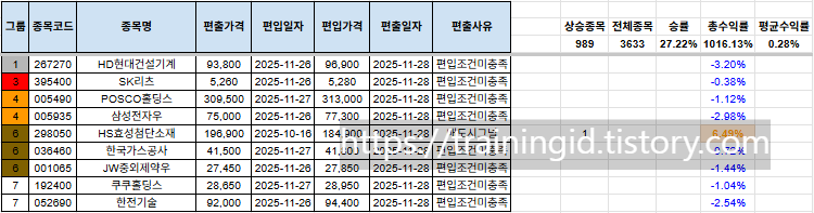 그리고, 모니터링 되는 종목들을 기존 시총 1,000억 원 이상에서 5,000억 원으로 대폭 줄였습니다. 1,000억 원으로 늘리니 모니터링 해야 하는 종목이 1천여 종목이 되어 매일 집계하는데 오랜 시간이 걸려 줄이게 되었습니다. 이 점 양해 바랍니다.