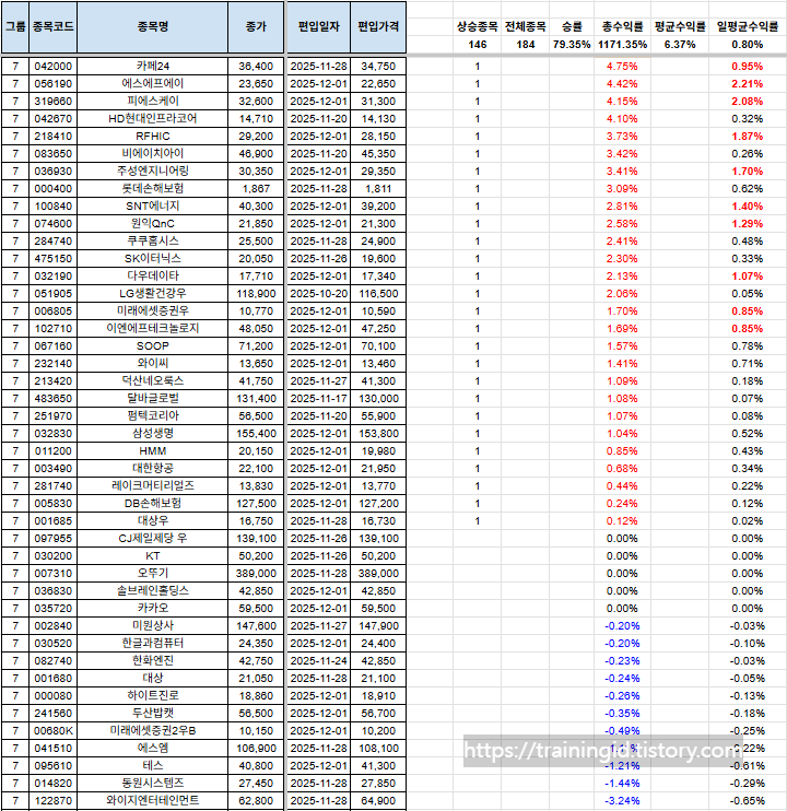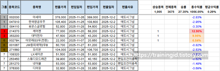 종목이 많이 걸러지는 관계로, 남아있는 포트폴리오, 신규 편입 종목, 당일 편출 종목만을 올려두겠습니다. 전일 자료는 전일 포스팅을 참고하여 주시기 바랍니다.