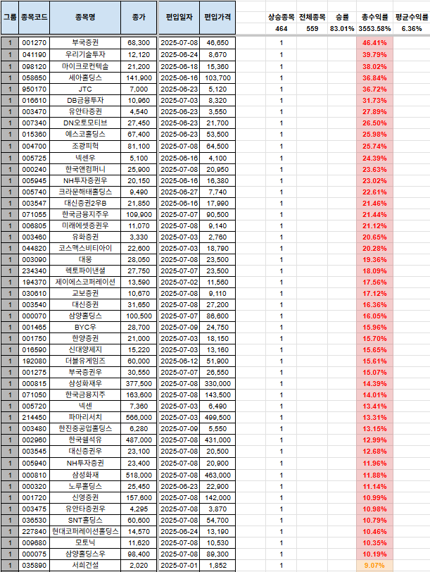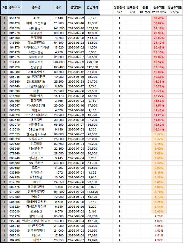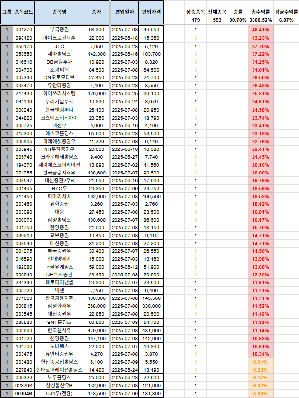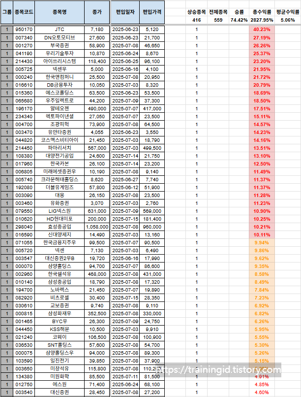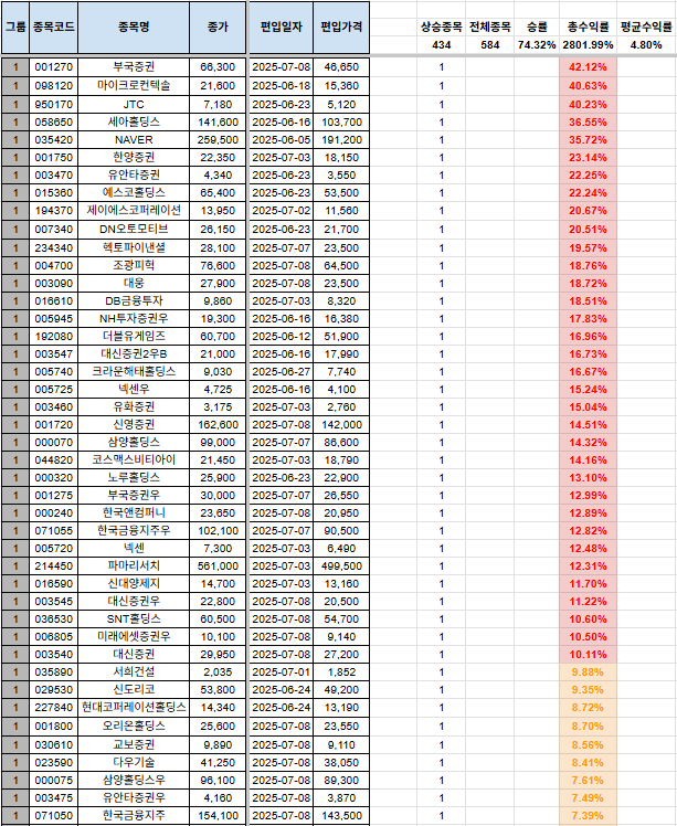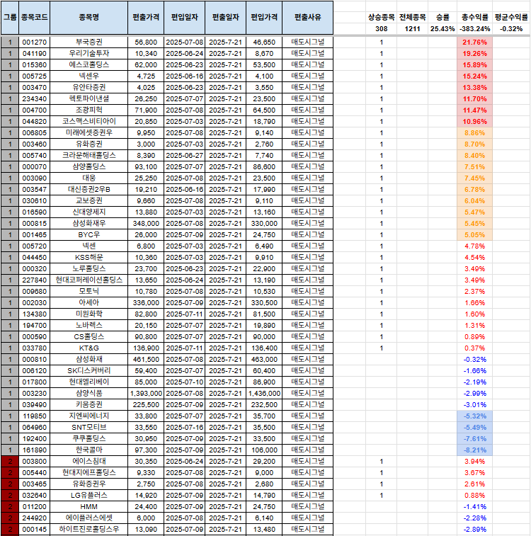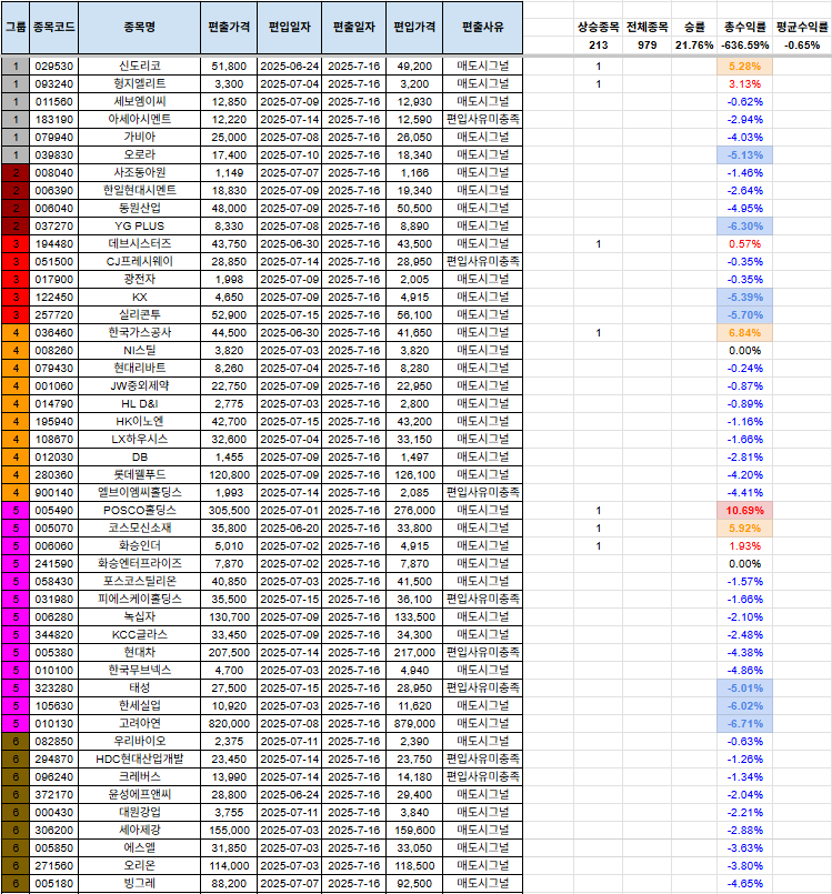 안녕하세요, 시나브로상승입니다. 기본적으로 손실을 짧고, 수익은 길게를 추구하고 있습니다. 종목이 많이 걸러지는 관계로, 남아있는 포트폴리오, 신규 편입 종목, 당일 편출 종목만을 올려두겠습니다. 전일 자료는 전일 포스팅을 참고하여 주시기 바랍니다. 그리고, 그룹에 대한 질의 사항이 있어서 간단하게 설명 드리자면, 1그룹~7그룹까지 있으며, 1그룹으로 갈수록 강한 추세를 의미합니다. 7그룹은 이제 막 반등을 시작하는 그룹으로 해석하시면 됩니다. 많은 분들께 도움이 되면 좋겠다는 생각입니다. 다만, 본 내용을 참고하여 투자를 하는 것은 전적으로 본인에게 책임이 있으며, 이 블로그의 글의 내용과 블로그 주인장과 아무런 관련이 없음을 명확히 밝힙니다. [편출 로그] [편출 후 포트폴리오] [신규 편입]