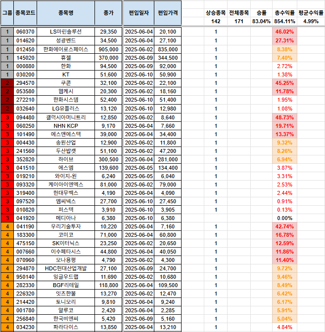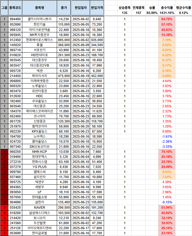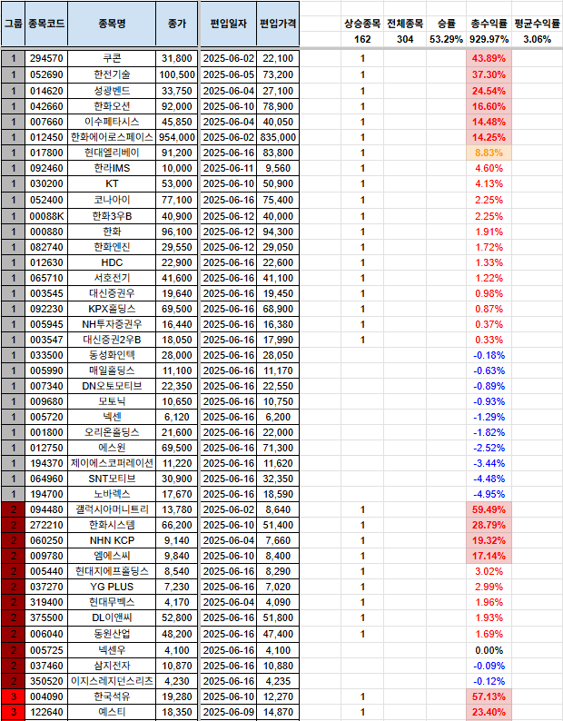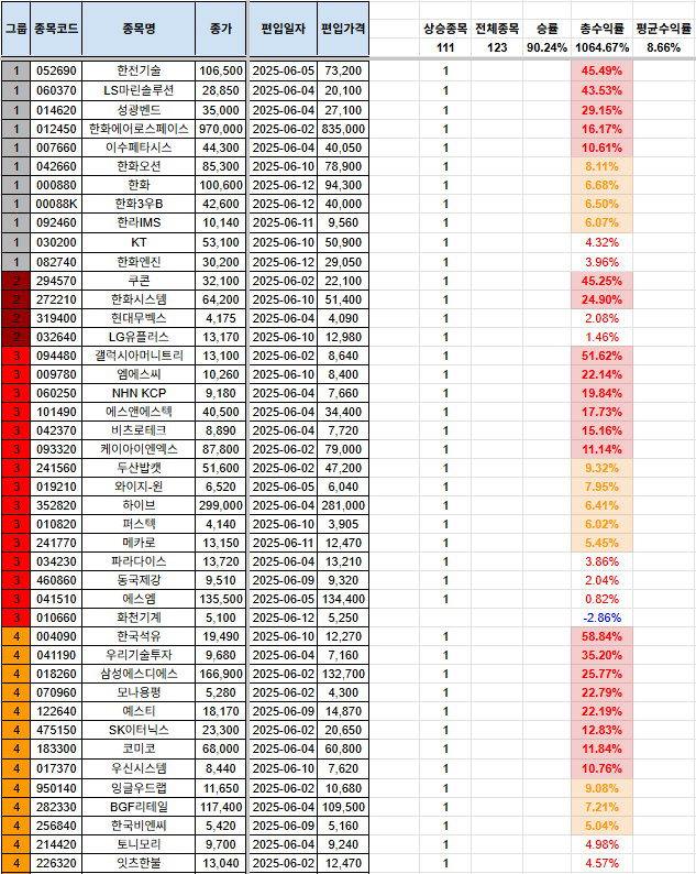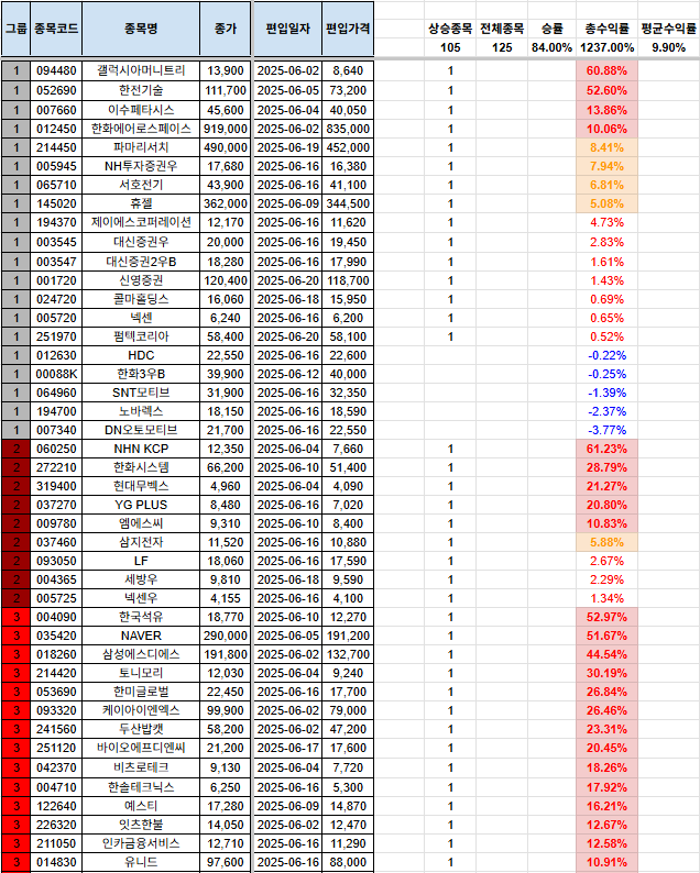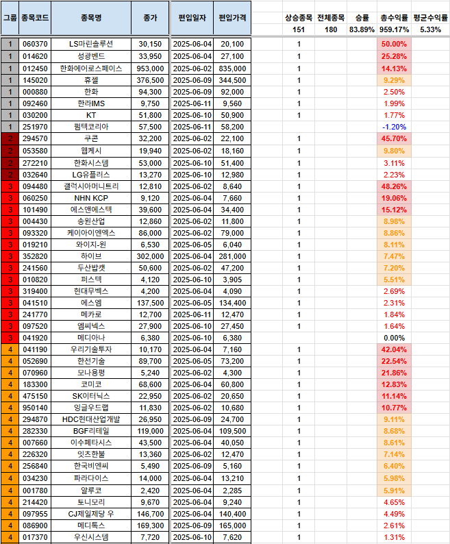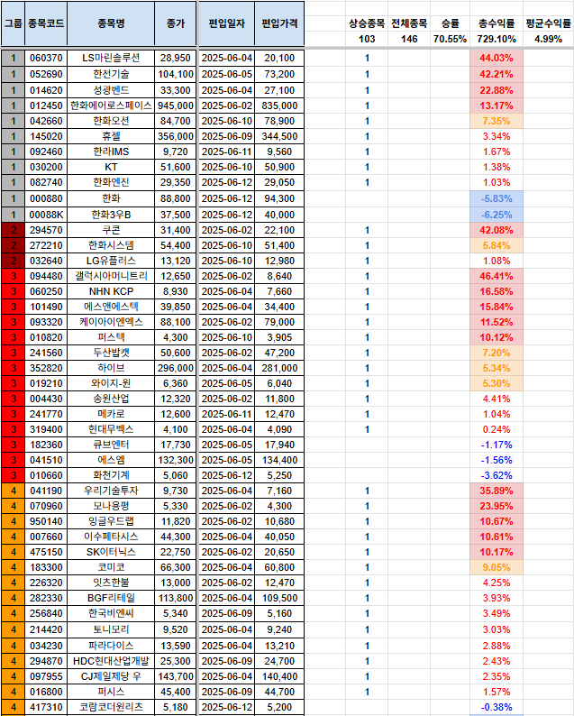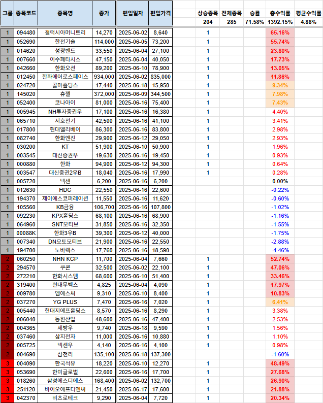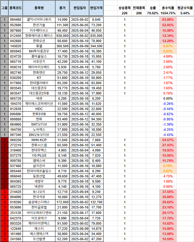 안녕하세요, 시나브로상승입니다. 기본적으로 손실을 짧고, 수익은 길게를 추구하고 있습니다. 종목이 많이 걸러지는 관계로, 남아있는 포트폴리오, 신규 편입 종목, 당일 편출 종목만을 올려두겠습니다. 전일 자료는 전일 포스팅을 참고하여 주시기 바랍니다. 그리고, 그룹에 대한 질의 사항이 있어서 간단하게 설명 드리자면, 1그룹~7그룹까지 있으며, 1그룹으로 갈수록 강한 추세를 의미합니다. 7그룹은 이제 막 반등을 시작하는 그룹으로 해석하시면 됩니다. 많은 분들께 도움이 되면 좋겠다는 생각입니다. 다만, 본 내용을 참고하여 투자를 하는 것은 전적으로 본인에게 책임이 있으며, 이 블로그의 글의 내용과 블로그 주인장과 아무런 관련이 없음을 명확히 밝힙니다. [편입 후 포트폴리오](기존 종목군) (신규 편입 종목군..