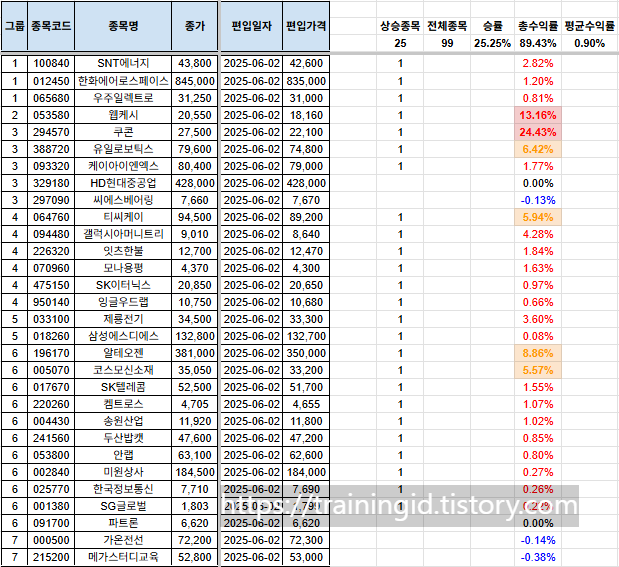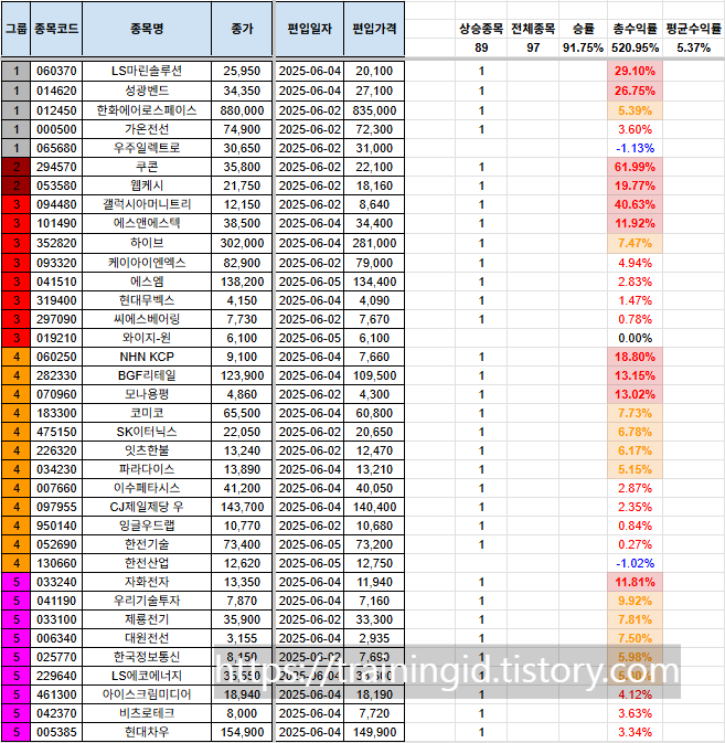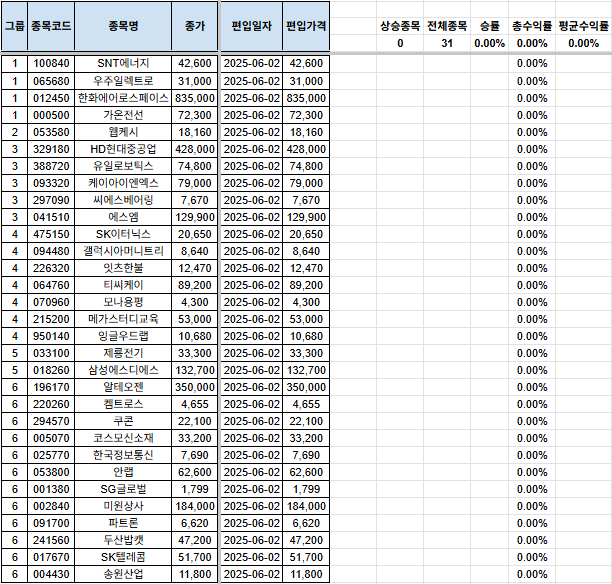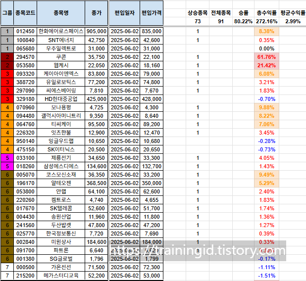 안녕하세요, 시나브로상승입니다. 앞으로 가급적 매일 편입 편출 종목을 정리하여 올려드리겠습니다. 그리고, 그룹에 대한 질의 사항이 있어서 간단하게 설명 드리자면, 1그룹~7그룹까지 있으며, 1그룹으로 갈수록 강한 추세를 의미합니다. 7그룹은 이제 막 반등을 시작하는 그룹으로 해석하시면 됩니다. 많은 분들께 도움이 되면 좋겠다는 생각입니다. 다만, 본 내용을 참고하여 투자를 하는 것은 전적으로 본인에게 책임이 있으며, 이 블로그의 글의 내용과 블로그 주인장과 아무런 관련이 없음을 명확히 밝힙니다. [편입 후 포트폴리오](기존 종목군) (신규 편입 종목군) [편출 로그]