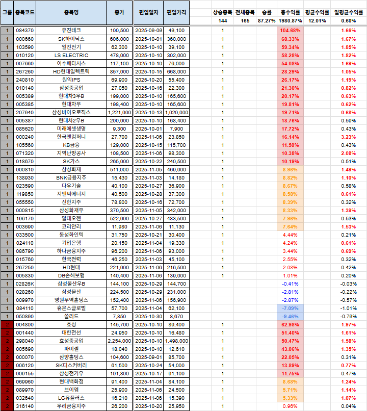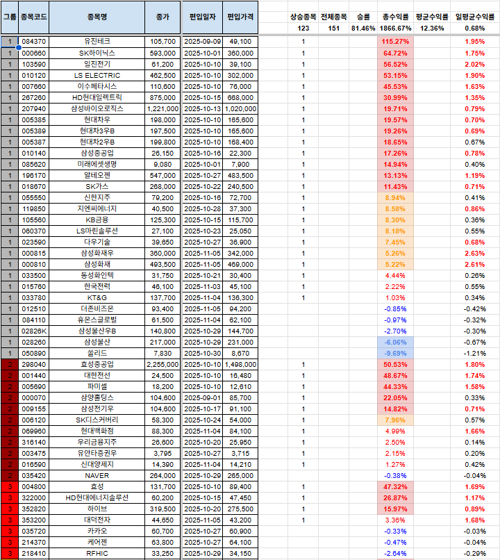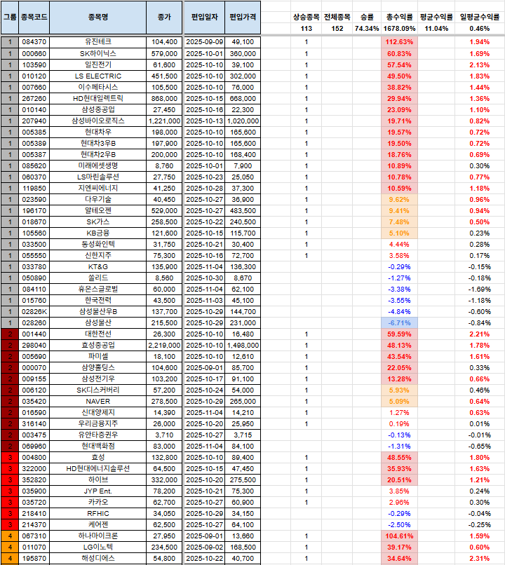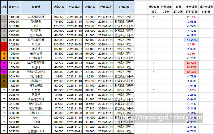 안녕하세요, 시나브로상승입니다. 기본적으로 손실을 짧고, 수익은 길게를 추구하고 있습니다. 종목이 많이 걸러지는 관계로, 남아있는 포트폴리오, 신규 편입 종목, 당일 편출 종목만을 올려두겠습니다. 전일 자료는 전일 포스팅을 참고하여 주시기 바랍니다. 그리고, 그룹에 대한 질의 사항이 있어서 간단하게 설명 드리자면, 1그룹~7그룹까지 있으며, 1그룹으로 갈수록 강한 추세를 의미합니다. 7그룹은 이제 막 반등을 시작하는 그룹으로 해석하시면 됩니다. 그리고, 모니터링 되는 종목들을 기존 시총 1,000억 원 이상에서 5,000억 원으로 대폭 줄였습니다. 1,000억 원으로 늘리니 모니터링 해야 하는 종목이 1천여 종목이 되어 매일 집계하는데 오랜 시간이 걸려 줄이게 되었습니다. 이 점 양해 바랍니다. 그럼에..