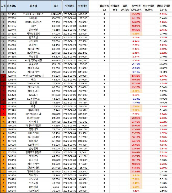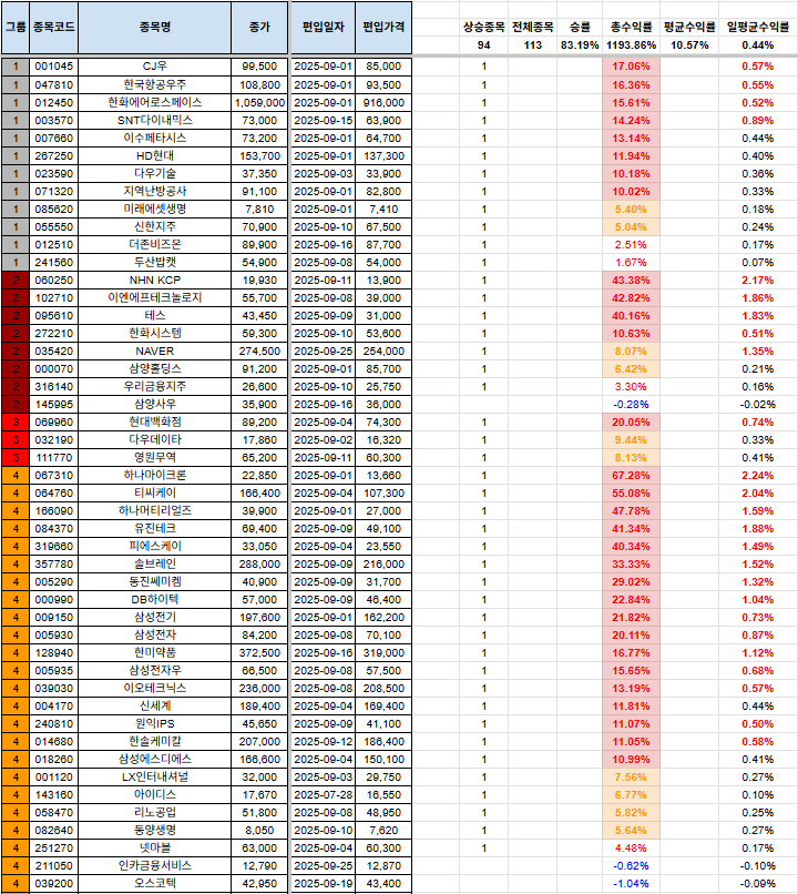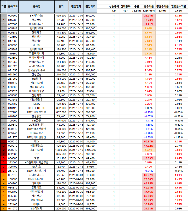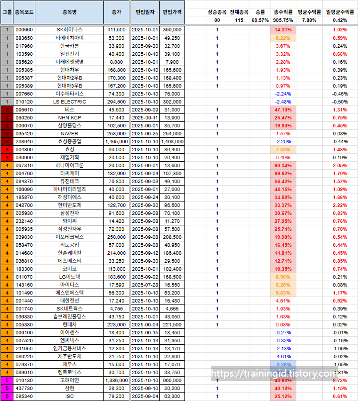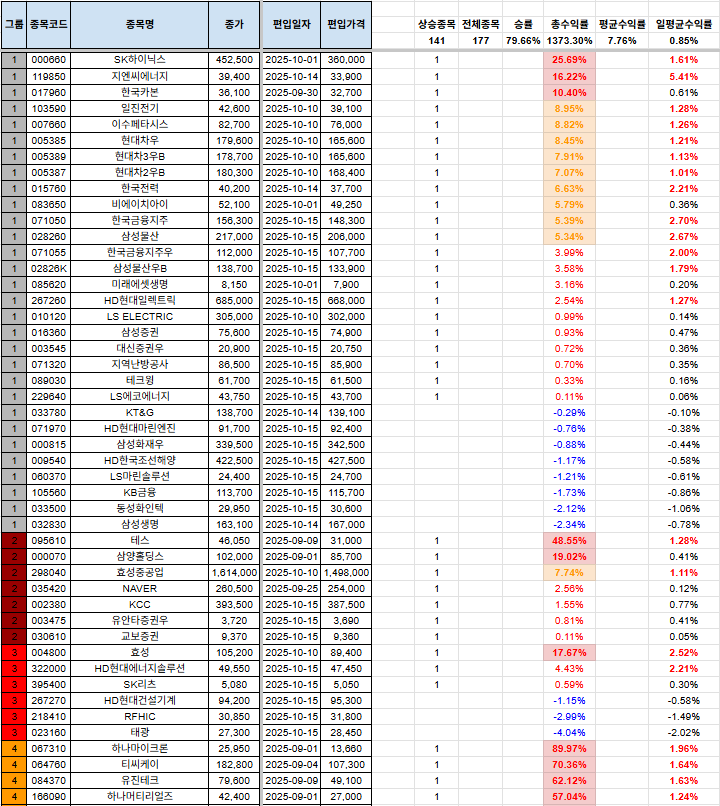 안녕하세요, 시나브로상승입니다. 기본적으로 손실을 짧고, 수익은 길게를 추구하고 있습니다. 종목이 많이 걸러지는 관계로, 남아있는 포트폴리오, 신규 편입 종목, 당일 편출 종목만을 올려두겠습니다. 전일 자료는 전일 포스팅을 참고하여 주시기 바랍니다. 그리고, 그룹에 대한 질의 사항이 있어서 간단하게 설명 드리자면, 1그룹~7그룹까지 있으며, 1그룹으로 갈수록 강한 추세를 의미합니다. 7그룹은 이제 막 반등을 시작하는 그룹으로 해석하시면 됩니다. 그리고, 모니터링 되는 종목들을 기존 시총 1,000억 원 이상에서 5,000억 원으로 대폭 줄였습니다. 1,000억 원으로 늘리니 모니터링 해야 하는 종목이 1천여 종목이 되어 매일 집계하는데 오랜 시간이 걸려 줄이게 되었습니다. 이 점 양해 바랍니다. 그럼에..