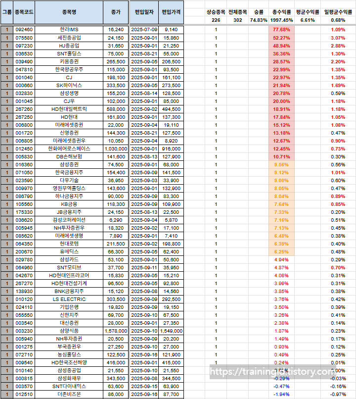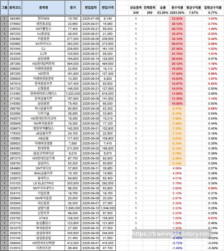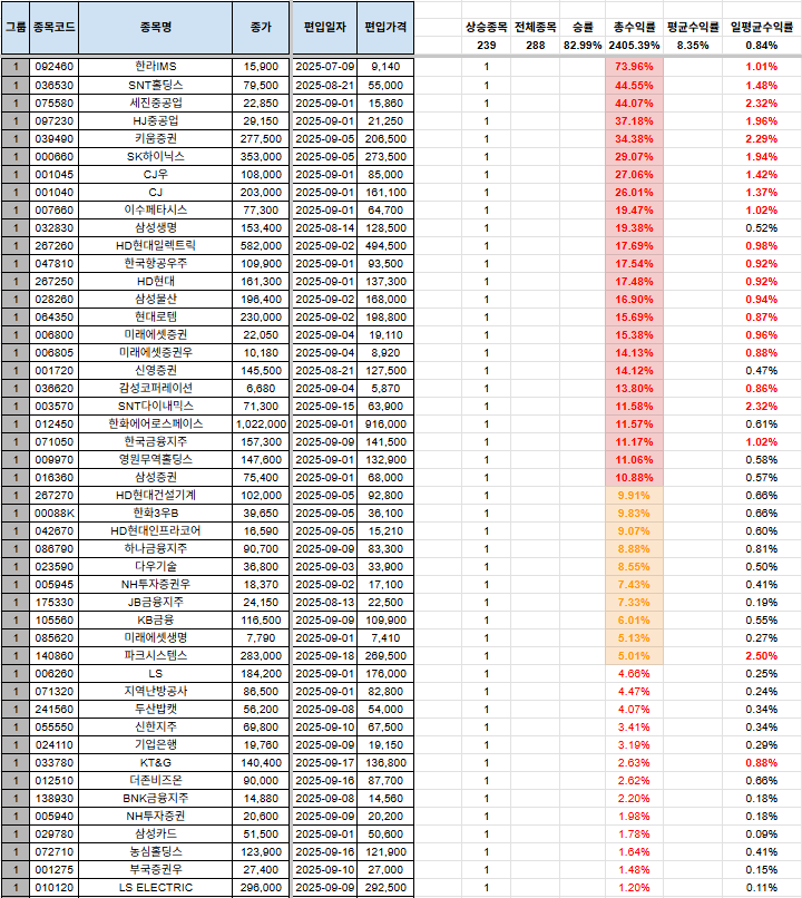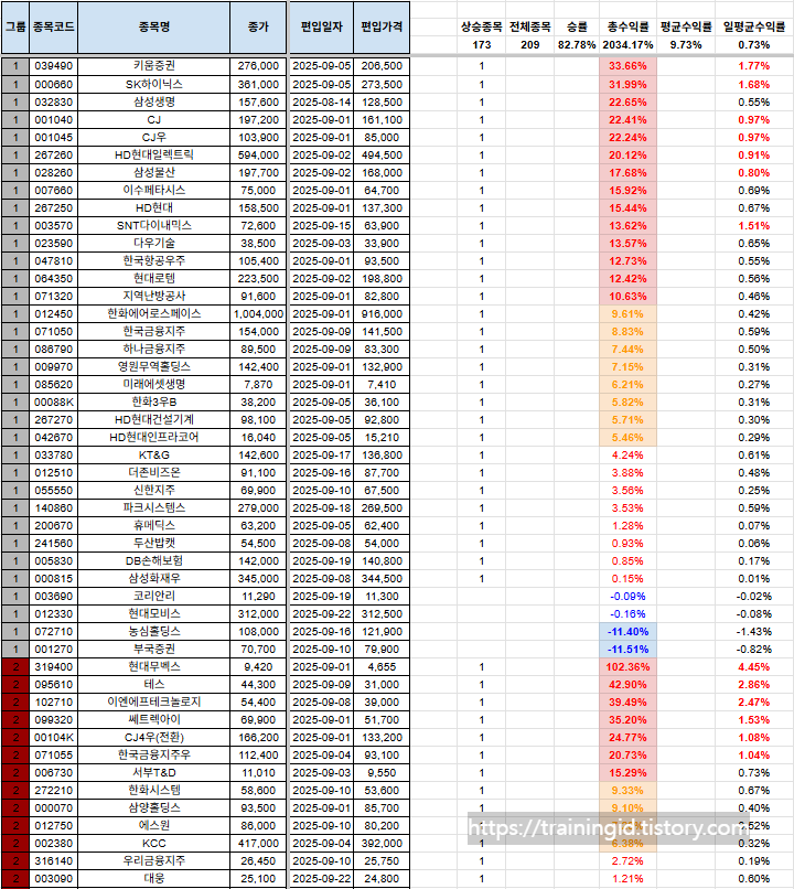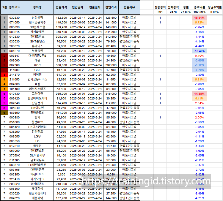 녕하세요, 시나브로상승입니다. 기본적으로 손실을 짧고, 수익은 길게를 추구하고 있습니다. 종목이 많이 걸러지는 관계로, 남아있는 포트폴리오, 신규 편입 종목, 당일 편출 종목만을 올려두겠습니다. 전일 자료는 전일 포스팅을 참고하여 주시기 바랍니다. 그리고, 그룹에 대한 질의 사항이 있어서 간단하게 설명 드리자면, 1그룹~7그룹까지 있으며, 1그룹으로 갈수록 강한 추세를 의미합니다. 7그룹은 이제 막 반등을 시작하는 그룹으로 해석하시면 됩니다. 그리고, 모니터링 되는 종목들을 기존 시총 1,000억 원 이상에서 5,000억 원으로 대폭 줄였습니다. 1,000억 원으로 늘리니 모니터링 해야 하는 종목이 1천여 종목이 되어 매일 집계하는데 오랜 시간이 걸려 줄이게 되었습니다. 이 점 양해 바랍니다. 그럼에도..