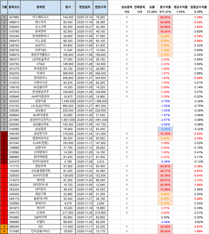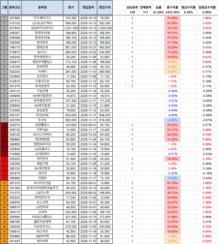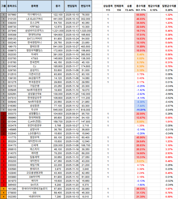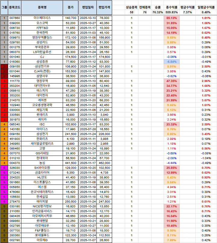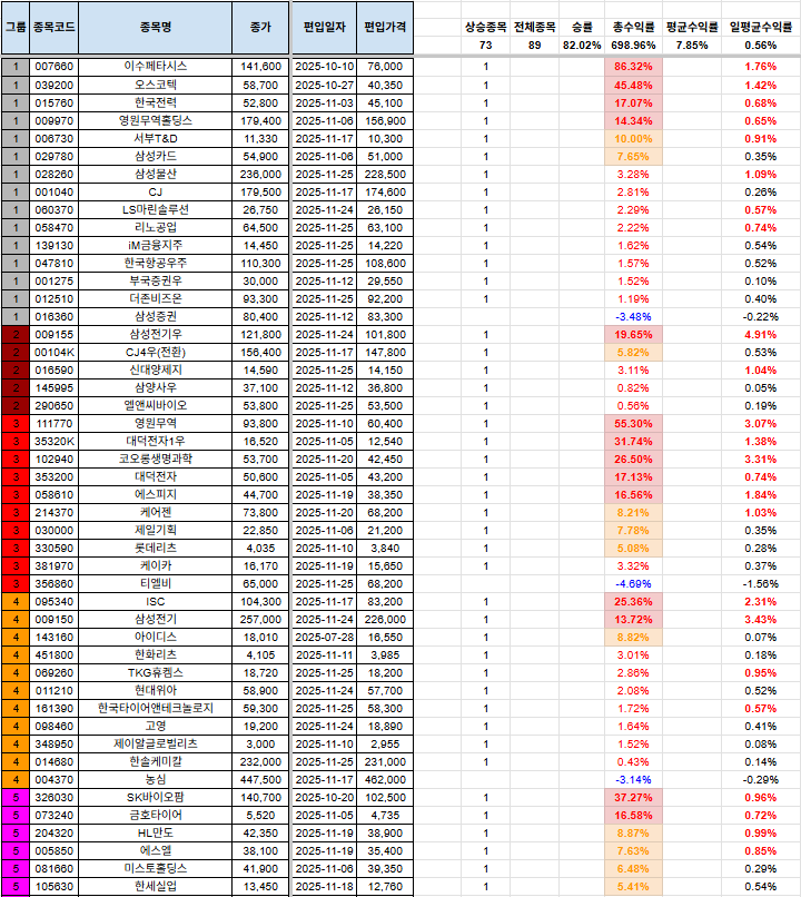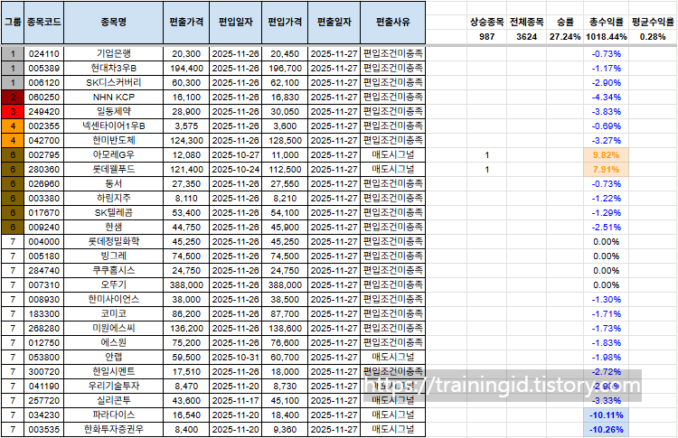 안녕하세요, 시나브로상승입니다. 기본적으로 손실을 짧고, 수익은 길게를 추구하고 있습니다. 종목이 많이 걸러지는 관계로, 남아있는 포트폴리오, 신규 편입 종목, 당일 편출 종목만을 올려두겠습니다. 전일 자료는 전일 포스팅을 참고하여 주시기 바랍니다. 그리고, 그룹에 대한 질의 사항이 있어서 간단하게 설명 드리자면, 1그룹~7그룹까지 있으며, 1그룹으로 갈수록 강한 추세를 의미합니다. 7그룹은 이제 막 반등을 시작하는 그룹으로 해석하시면 됩니다. 그리고, 모니터링 되는 종목들을 기존 시총 1,000억 원 이상에서 5,000억 원으로 대폭 줄였습니다. 1,000억 원으로 늘리니 모니터링 해야 하는 종목이 1천여 종목이 되어 매일 집계하는데 오랜 시간이 걸려 줄이게 되었습니다. 이 점 양해 바랍니다. 그럼에..